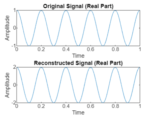 - 繪製原始訊號和重建訊號的實部以進行比較。