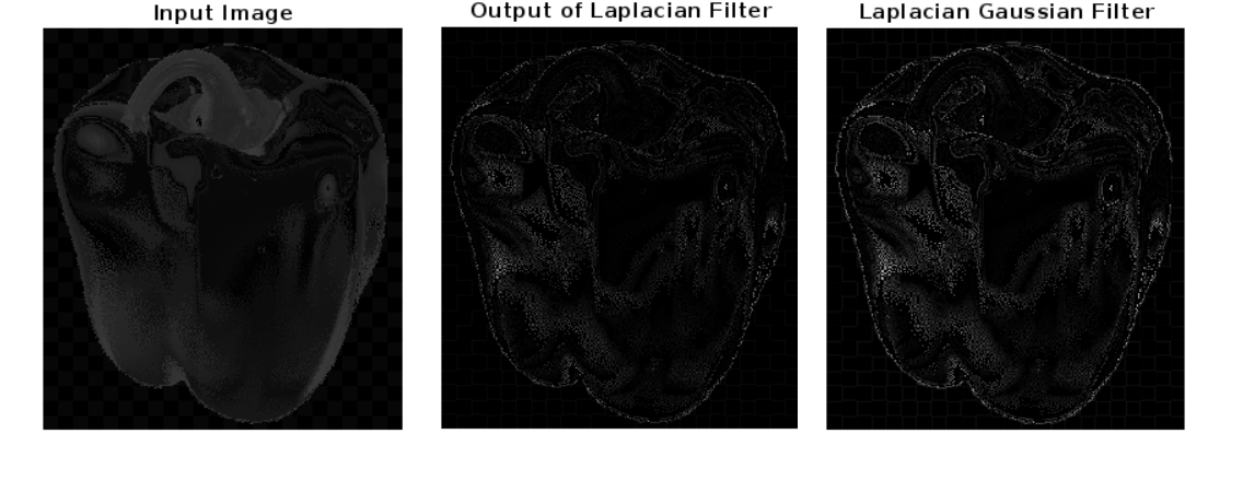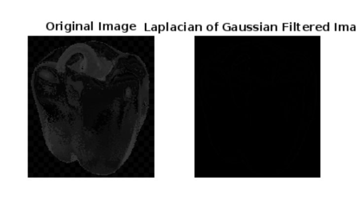 此示例顯示了將兩種不同的濾波器(拉普拉斯濾波器和高斯-拉普拉斯 (LoG) 濾波器)應用於輸入影像“peppers.jpg”