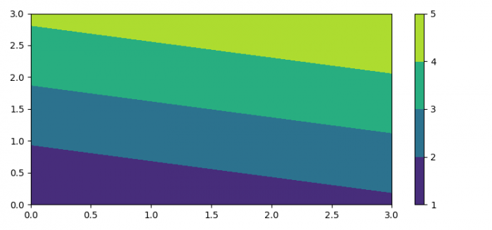 import numpy as np import matplotlib.pyplot as plt plt.rcParams["figure.figsize"] = [7.50, 3.50] plt.rcParams["figure.autolayout"] = True data = np.linspace(0, 10, num=16).reshape(4, 4) cf = plt.contourf(data, levels=(0, 2.5, 5, 7.5, 10)) cb = plt.colorbar(cf) cb.set_ticklabels([1, 2, 3, 4, 5]) plt.show()