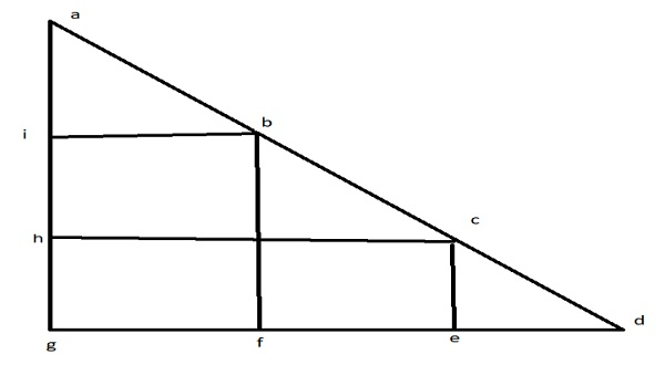 給定一個直角等腰三角形。等腰三角形是指兩條邊長度相等的三角形。直角三角形是指高(圖中的ag)和底(圖中的dg)相互垂直的三角形。目標是找到可以放入這個邊長為2個平方單位的直角等腰三角形中的最大正方形數量。底邊或高(兩者相等)作為輸入。正方形的數量作為輸出。