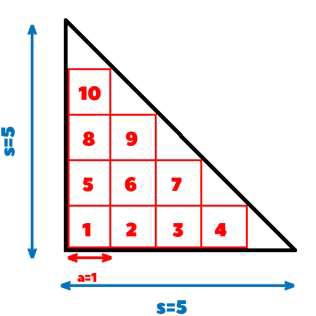 類似地,當放置底部4個正方形時,我們得到一個新的等腰三角形,底邊為(s-a),然後我們重複相同的步驟,得到3個正方形,依此類推,直到頂部放置一個正方形。