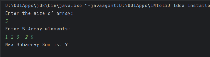 import java.util.Scanner; public class KadaneAlgo { static int FindMaxSubArraySum(int[] arr, int n) { int currentSum = 0, maxSum = Integer.MIN_VALUE; for (int i = 0; i < n; i++) { currentSum = Math.max(arr[i], currentSum + arr[i]); maxSum = Math.max(maxSum, currentSum); } return maxSum; } public static void main(String[] args) { Scanner sc = new Scanner(System.in); System.out.println("Enter the size of array: "); int n = sc.nextInt(); int[] arr = new int[n]; System.out.println("Enter " + n + " Array elements: "); for (int i = 0; i < n; i++) { arr[i] = sc.nextInt(); } long maxSum = FindMaxSubArraySum(arr, n); System.out.println("Max Subarray Sum is: " + maxSum); } }