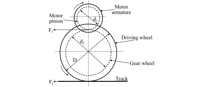 此處,驅動電機的電樞連線著一個直徑為 d1 的小齒輪。小齒輪邊緣的牽引力透過齒輪傳動到驅動輪。