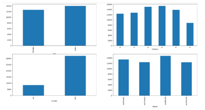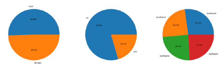 匯入所需的庫後,資料集將儲存到python資料框中。然後,程式碼檢查資料集中是否存在空值,並相應地繪製餅圖和條形圖以視覺化資料集中性別、地區和吸菸者列的分佈和比例。