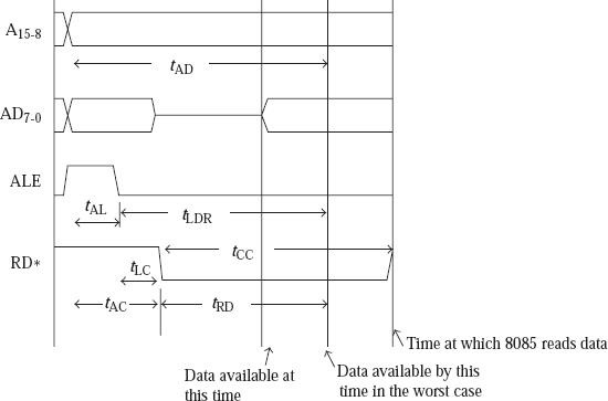 例如,我們檢查一下,如果使用27128A-20 16K×8 EPROM晶片,並且在不使用任何等待狀態的情況下與工作在320 nS時鐘週期的8085處理器一起使用。因此,對於介面記憶體晶片,最重要的時序引數是tcc、tCE和tOE。