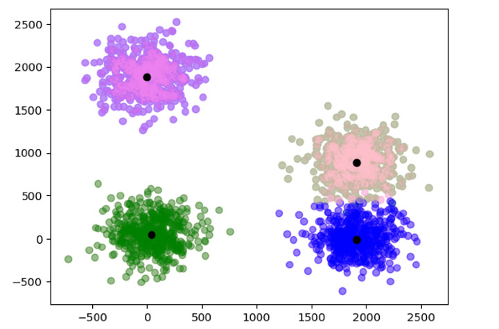from sklearn.cluster import MiniBatchKMeans from sklearn.datasets import make_blobs as blobs import matplotlib.pyplot as plt import timeit as t c = [[50, 50],[1900, 0],[1900, 900],[0, 1900]] data, data_labels = blobs(n_samples = 2000, centers = c, cluster_std = 200) color = ['pink', 'violet', 'green', 'blue'] for i in range(len(data)): plt.scatter(data[i][0], data[i][1], color = color[data_labels[i]], alpha = 0.4) k_means = MiniBatchKMeans(n_clusters=4, batch_size = 40) st = t.default_timer() k_means.fit(data) e = t.default_timer() label_a = k_means.labels_ cnt = k_means.cluster_centers_ print("Time taken : ",e-st) for i in range(len(data)): plt.scatter(data[i][0],data[i][1], color = color[label_a[i]], alpha = 0.4) for i in range(len(cnt)): plt.scatter(cnt[i][0], cnt[i][1], color = 'black')