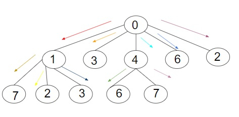 解釋 -給定一個樹,共有11個節點,包括根節點和其他所有節點。給定樹的根節點是0,它將首先將資料傳遞給節點1(因為它有很多子節點,然後是其他節點),然後根節點將資料傳遞給節點4,然後傳遞給3,然後傳遞給6,最後傳遞給2。因此,總共需要的迭代次數為5。