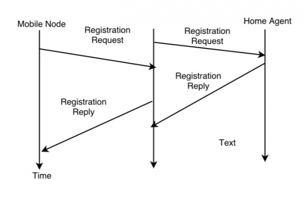 在這個階段,移動節點向外部代理和家庭代理註冊其當前位置。如果連線位置被識別為外部位置,則移動節點會查詢外部代理並在外部位置和外部代理處註冊自身,而外部代理會依次通知家庭代理並在自身與家庭代理之間建立隧道。在此階段,移動節點向外部代理傳送註冊請求訊息,該代理將訊息轉發到家庭代理。家庭代理在使用家庭地址和“關照”地址對映更新其登錄檔後傳送回覆。下圖描述了這些訊息的流程。