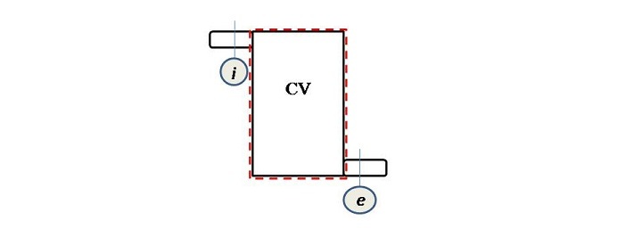 穩態流動能量方程 (SFEE) 是能量守恆定律在開放系統中的應用。下圖是開放系統的示意圖,其中流體從 𝑖 進入,從 𝑒 出口。紅色虛線表示控制體積 (CV) 的控制面 (CS)。