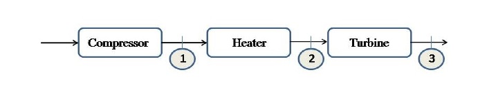 空氣 (𝑅 = 0.287 kJ/kg-K,$\mathrm{c_p}$ = 1.005 kJ/kg-K,和 𝛾 = 1.4) 依次流過壓縮機、加熱器和渦輪機,如圖所示。當壓力和溫度分別為 276 kPa 和 316 K 時,從壓縮機出來的空氣的體積流量為 2.33 $\mathrm{m^3/s}$。然後在加熱器中以相同的壓力將空氣加熱到 703 K。從加熱器中,空氣流過一個產生 1860 kW 功率的渦輪機。從渦輪機到周圍環境的熱損失為 90 kW。渦輪機出口處的空氣溫度(K)是多少?