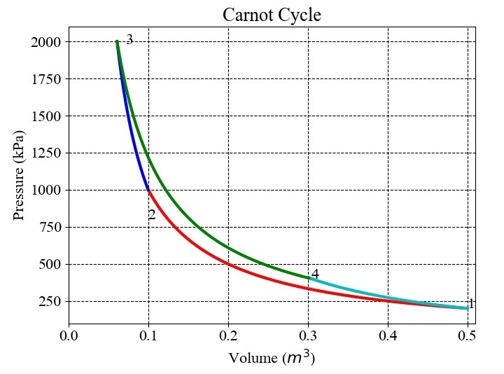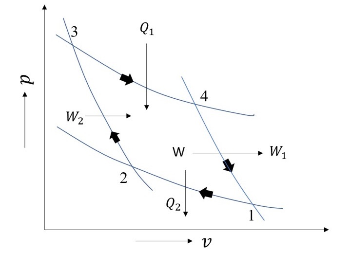 所有熱力學迴圈都具有卡諾迴圈所確定的上限。它包含兩個可逆絕熱過程和兩個等溫過程,總共四個過程。等溫過程涉及熱量的新增和排放,而可逆絕熱過程涉及功的相互作用。下圖顯示了卡諾迴圈的示意圖。