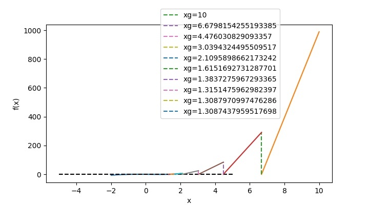 plot([xn, xn], [0, f(xn)], '--', label=f'xg={xg}')