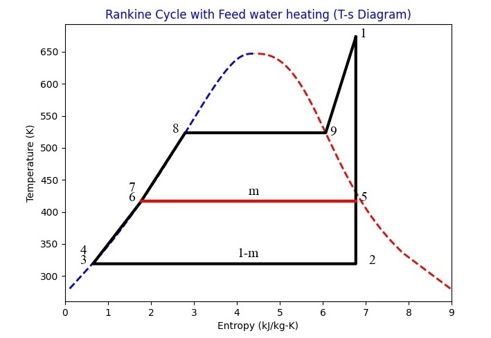 title('Rankine Cycle with Feed water heating (T-s Diagram)',color='b')