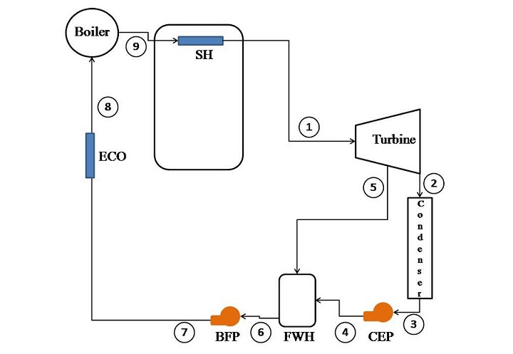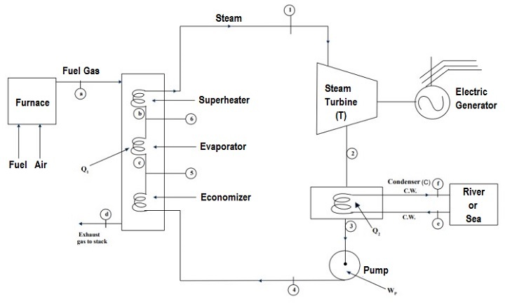 朗肯迴圈是任何熱電廠的核心。基本的朗肯迴圈有四個過程,即汽輪機和泵中的可逆絕熱功相互作用,以及鍋爐和冷凝器中的等壓熱相互作用。