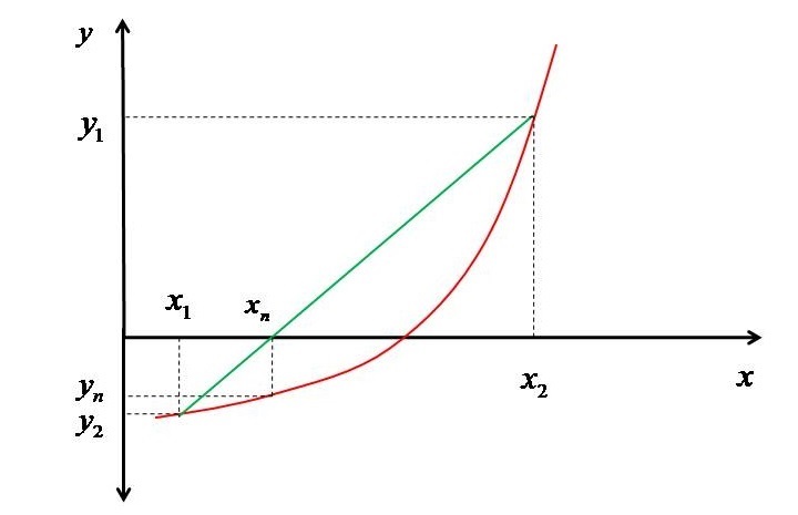 首先,我們搜尋了兩個 𝑥 值 $\mathrm{x_{1}}$ 和 $\mathrm{x_{2}}$,在這些值處函式的值 ($\mathrm{y_{1}} $和 $\mathrm{y_{2}}$) 不同,這意味著這些點應該使得這兩個值的乘積為負(即,它們應該位於 X 軸的兩側)。由於這些不是精確點,即根存在的點,因此它們被視為假點,因此稱為 Regula Falsi 方法。現在,這些點將由一條線連線,該線將在 $\mathrm{x_{n}}$ 點與 x 軸相交。現在,對應於此將計算 $y_{n}$。