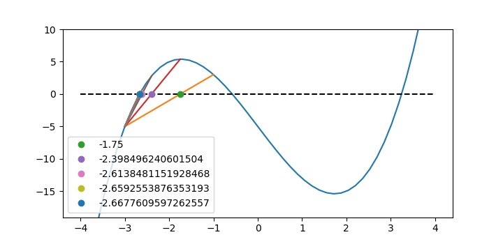 # Selecting false positions x1 and x2 x1=-3 x2=-1 # Evaluating corresponding y1 and y2 y1=f(x1) y2=f(x2)