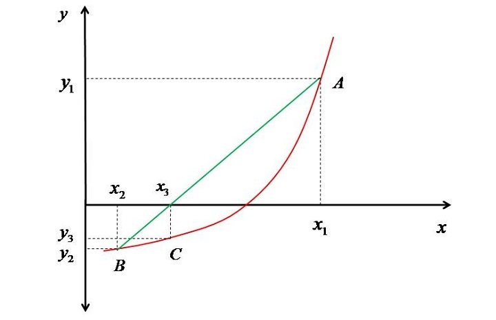 $$\mathrm{x_{i}=x_{i-2}-y_{i-2}\frac{x_{i-1}-x_{i-2}}{y_{i-1}-y_{i-2}}}$$
