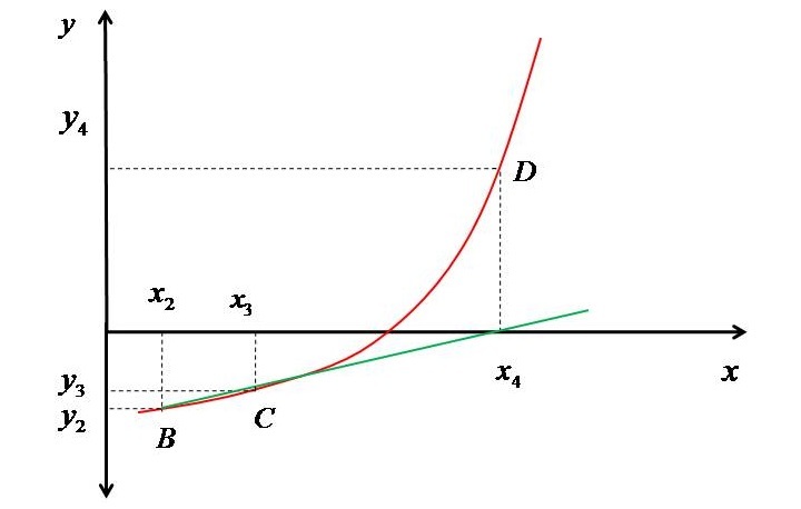 割線與 x 軸相交於點 $\mathrm{𝑥_{3}}$,由於 $\mathrm{𝑥_{3}}$ 和 $\mathrm{𝑥_{2}}$ 不接近(即它們的絕對差是有限的),我們找到對應於 $\mathrm{𝑥_{3}}$ 曲線上的點,即 C。然後,我們考慮點 B 和 C 連線一條割線。我們將這條線延伸到到達 X 軸,並將該點標記為 $\mathrm{𝑥_{4}}$。