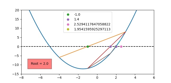 然後,我們再次在 C 和 D 之間繪製一條割線,直到“x”的下一個值和前一個值的距離收斂到一個非常小的值。因此,我們可以說該方法依次找到多項式的根,即它可以被認為是根的順序搜尋。這種方法的優點在於,x 是否位於根的一側或圍繞根並不重要。該方法透過上述解釋的順序搜尋逐漸收斂到根。