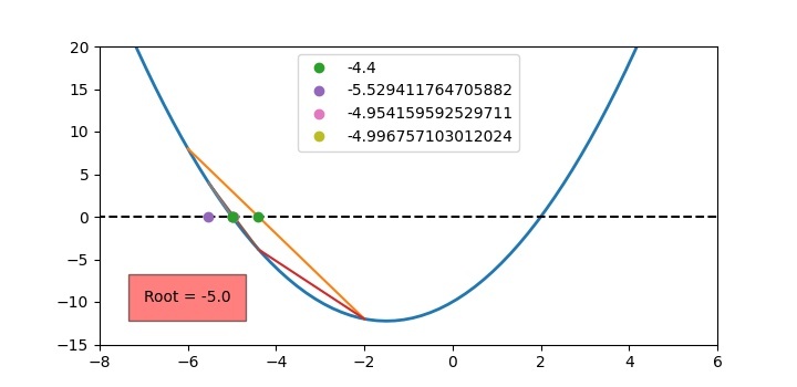 對於其他根,您可以將初始“x”取為:−6 和 −2。然後結果如下所示