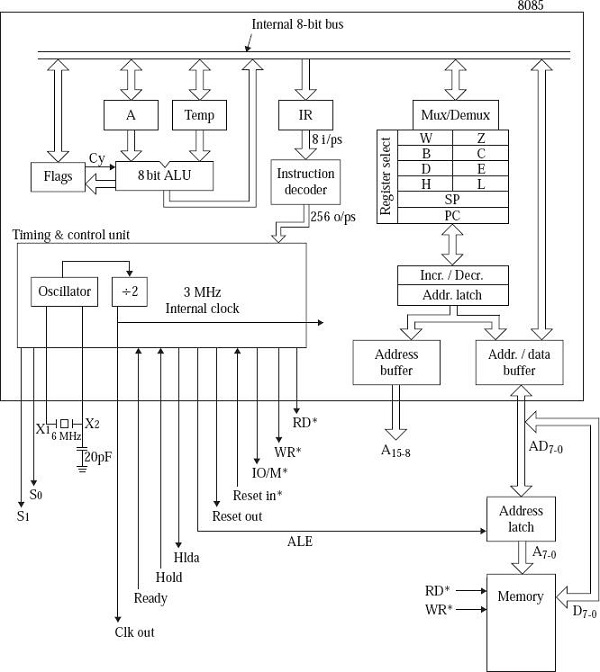 讓我們考慮給定指令“MOV D, A”的整個執行過程。在這種情況下,累加器的位值被移動到暫存器D。8位值被髮送到累加器。暫存器B、C、D、E、H和L透過多路複用器/多路分解器連線到內部匯流排。給定的暫存器為多路分解器選擇相應的程式碼,以便名為D的暫存器從內部匯流排接收所有內容到多路分解器。實際上,基本概念在於,在多路複用器中,許多輸入合併形成一個輸出。而多路分解器則適用反向過程。因此,在地址緩衝區中,我們發現執行的算術和邏輯序列操作涉及兩個運算元,其中一個運算元由累加器提供,另一個運算元由臨時暫存器提供。例如,在加法過程中,對B暫存器的指令,所有內容都被故意移動到臨時暫存器,然後算術邏輯單元最終執行暫存器A和臨時暫存器的加法。與W和Z類似