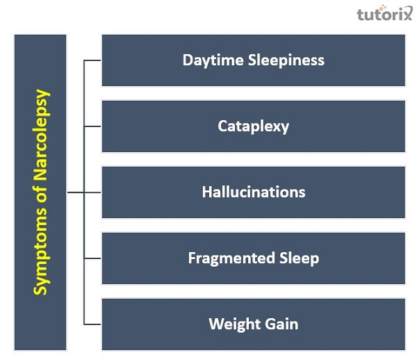 白天嗜睡 - 最突出和最主要的症狀是,一個人在白天感到睏倦,並且即使在進行活動時也確實會睡著。嗜睡通常可以被歸類為不可抗拒的,並且往往在不活動時會加重。突然失去意識而睡著是一個難以忍受的症狀,並且可以透過快速小睡來緩解。在嗜睡症中,快速眼動 (REM) 潛伏期特別短。