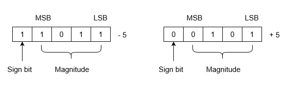 在用於表示帶符號數的二進位制數表示系統中,可以使用額外的位或標誌(稱為符號位或符號標誌)來區分負數。由於二進位制數的每一位只能是 0 或 1,因此無法在二進位制數前面新增減號或加號。這就是我們使用這個額外的位,即符號位或符號標誌的原因。負二進位制數的符號位值為 1,正數的符號位值為 0。