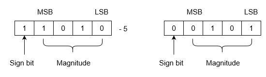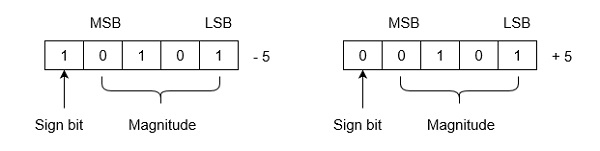 在這種方法中,數字分為兩部分:符號位和大小。如果數字為正,則符號位為 0;如果數字為負,則符號位為 1。大小用待表示數字的二進位制形式表示。