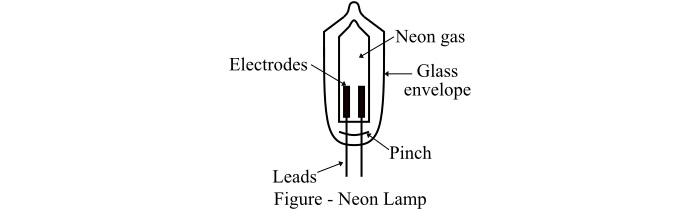 霓虹燈有兩個緊密間隔的電極,但不相互接觸,呈粗平行線螺旋或平板狀,密封在軟玻璃外殼內。玻璃外殼中充有約 8 託的氖氣。此外,帽內安裝了一個約 2000 歐姆的串聯電阻。