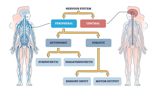 神經系統由兩個主要部分組成,包括中樞神經系統(CNS)和周圍神經系統。CNS 由兩個主要部分大腦和脊髓組成。大腦由各種相互溝通的神經膠質細胞和神經元網路組成。周圍神經系統由神經元成分組成,如自主神經和周圍神經。