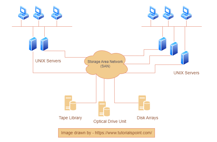 儲存區域網路 (SAN) 是一個高速的線上儲存外設網路。這些被配置為節點,以便於伺服器靈活地連線和斷開。SAN 對於儲存需求高的組織至關重要,並且優於 RAID 系統,因為它提供了多對多連線和更好的隔離功能。