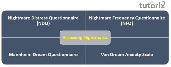 為了以更標準化的方式量化和評估噩夢的質量,已經設計了幾種評估工具。例如,噩夢頻率問卷 (NFQ) 可以評估噩夢的頻率。更具體地說,曼海姆夢境問卷記錄了兒童時期的噩夢頻率和成人中反覆出現的噩夢的相對數量。其他心理計量構建的工具,例如噩夢困擾問卷 (NDQ),評估了對噩夢的一般擔憂,包括對睡眠質量、白天信念和感知的影響。除此之外,一些工具側重於焦慮症狀,例如範夢境焦慮量表,或行為後果,例如噩夢行為問卷。