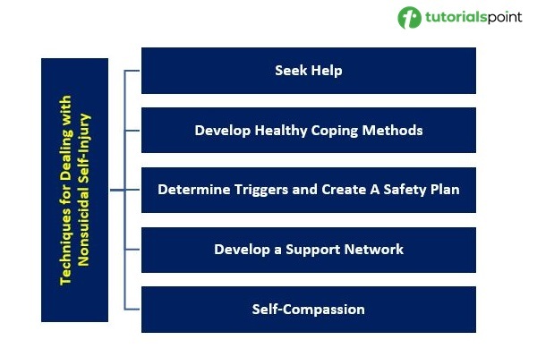發展健康的應對方法 − 尋找替代自傷行為的應對機制。深呼吸技巧、冥想、寫作、繪畫、聽音樂或進行體育鍛煉都是可能創造平靜感或轉移注意力的活動。