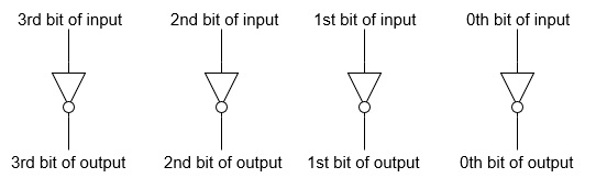 將二進位制數轉換為 1's 補碼有一個簡單的演算法。要獲得二進位制數的 1's 補碼,只需反轉給定的數字。您可以簡單地使用僅一個非門對二進位制數輸入的每一位實現邏輯電路。如下所示給出了 4 位 1's 補碼的邏輯電路實現。