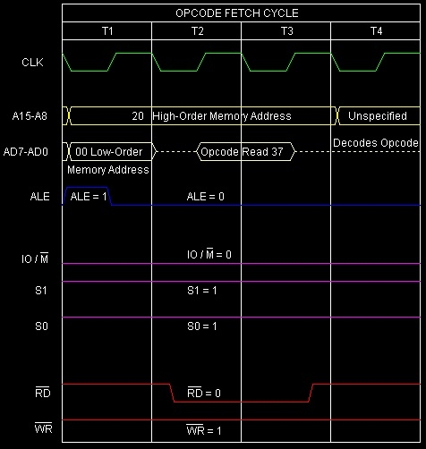 **總結:**因此,此指令**STC**需要1位元組、1個機器週期(操作碼提取)和4個T狀態來執行,如時序圖所示。