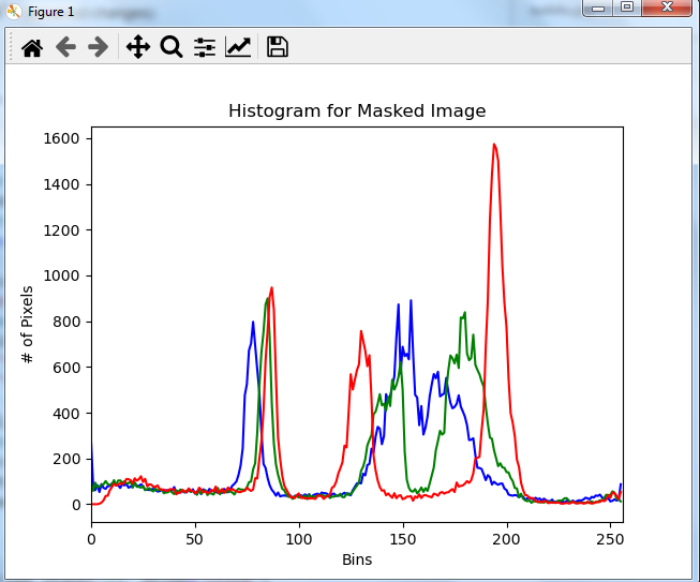# import required libraries import cv2 from matplotlib import pyplot as plt import numpy as np # Read the input image img = cv2.imread('architecture2.jpg') # define a function to compute and plot histogram def plot_histogram(img, title, mask=None): # split the image into blue, green and red channels channels = cv2.split(img) colors = ("b", "g", "r") plt.title(title) plt.xlabel("Bins") plt.ylabel("# of Pixels") # loop over the image channels for (channel, color) in zip(channels, colors): # compute the histogram for the current channel and plot it hist = cv2.calcHist([channel], [0], mask, [256], [0, 256]) plt.plot(hist, color=color) plt.xlim([0, 256]) # define a mask for our image; black for regions to ignore # and white for regions to examine mask = np.zeros(img.shape[:2], dtype="uint8") cv2.rectangle(mask, (160, 130), (410, 290), 255, -1) # display the masked region masked = cv2.bitwise_and(img, img, mask=mask) # compute a histogram for masked image plot_histogram(img, "Histogram for Masked Image", mask=mask) # show the plots plt.show() cv2.imshow("Mask", mask) cv2.imshow("Mask Image", masked) cv2.waitKey(0)