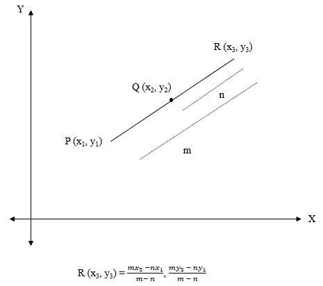 $$\mathrm{R(x_{3}\:,\:y_{3})\:=\;(\frac{mx_{2}\:-\:nx_{1}}{m\:-\:n}\:,\:\frac{my_{2}\:-\:ny_{1}}{m\:-\:n})}$$