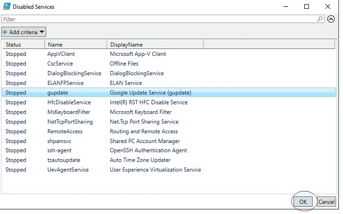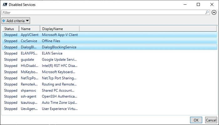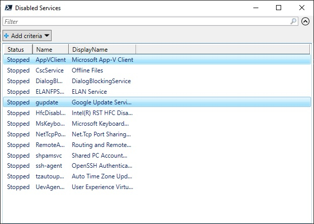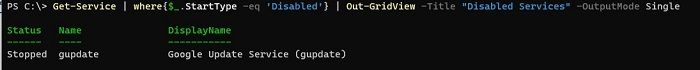 Out-GridView -Title "Disabled Services" -PassThru | `