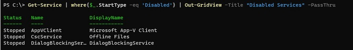$ser = Get-Service | where{$_.StartType -eq 'Disabled'} | Out-GridView -Title