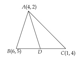- 三角形ABC的頂點為A(4, 2)、B(6, 5)和C(1, 4)。從A出發到BC的中線交BC於D。求點D的座標。