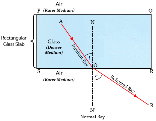 當一束光線在矩形玻璃磚中傳播,然後進入空氣中時,它會偏離法線。