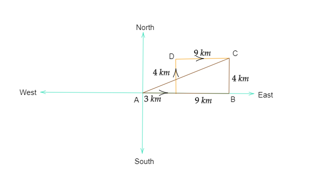 一個物體先向東行駛 $3\ km$,然後向北行駛 $4\ km$,最後向東行駛 $9\ km$。
