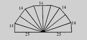 一把手搖扇是由10條相同尺寸的、兩種不同型別紙張製成的三角形條帶縫合而成,如圖所示。這些條帶的尺寸分別為25釐米、25釐米和14釐米。求製作這把扇子需要每種紙張的面積。
