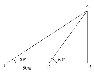 $\mathrm{CD}=50 \mathrm{~m}, \angle \mathrm{ACB}=30^{\circ}, \angle \mathrm{ADB}=60^{\circ}$