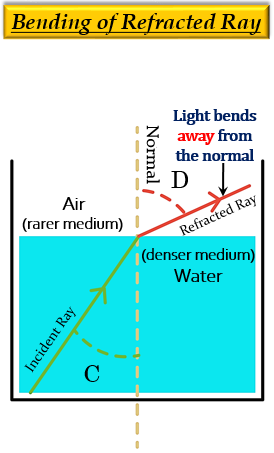 當光線穿過高折射率介質,如水(慢速介質或光學密度介質)到低折射率介質,如空氣(快速介質或光學稀疏介質)時,它的速度會增加,並偏離法線,使折射角大於入射角。