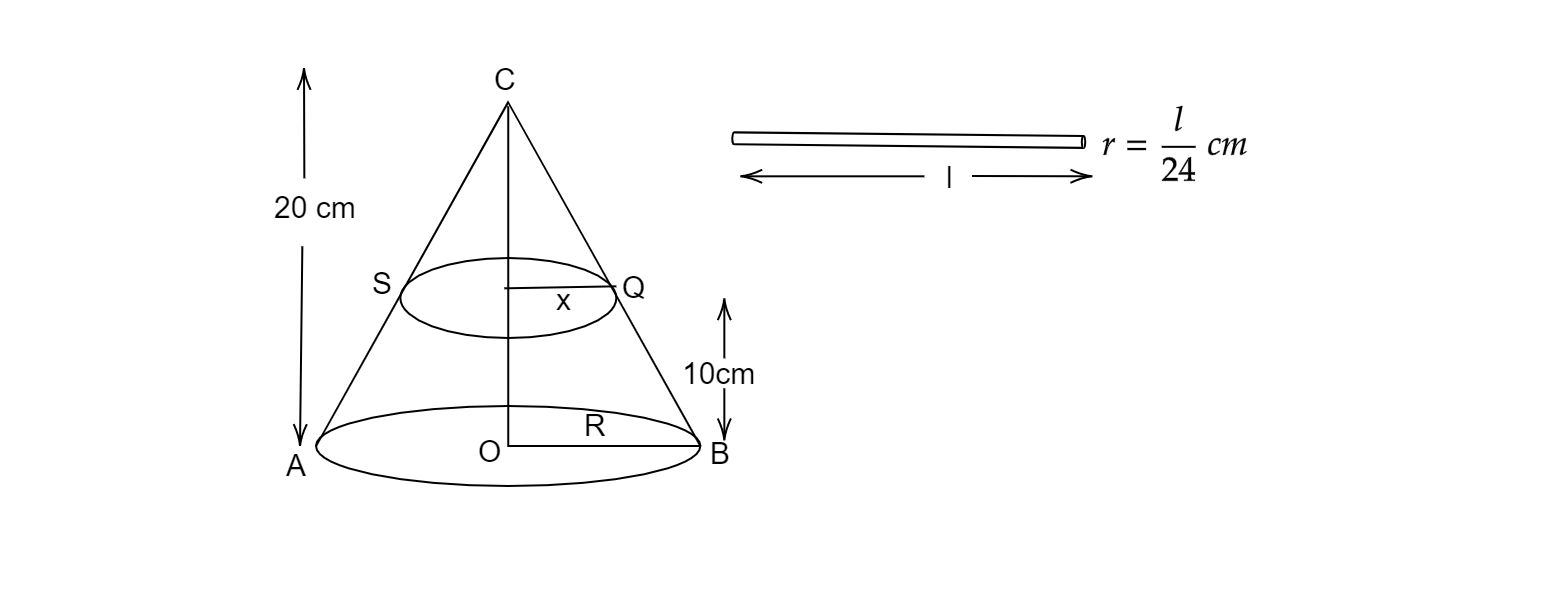 這裡,圓錐體的高度,$OC = 20 cm=H$