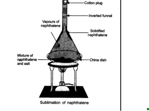 將混合物放在瓷皿中,並將其放在支架上。將一個倒置的漏斗放在瓷皿中混合物的上方,漏斗頸部用塞子塞住。加熱時,昇華物會收集在漏斗上,而食鹽則留在瓷皿中。