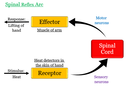 (a) 什麼是反射動作?請舉例說明。(b) 定義反射弧。給出脊髓反射弧的流程圖。(c) 不隨意動作和反射動作有何不同?