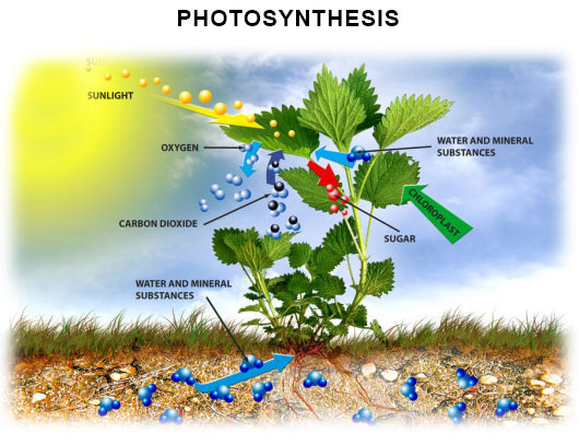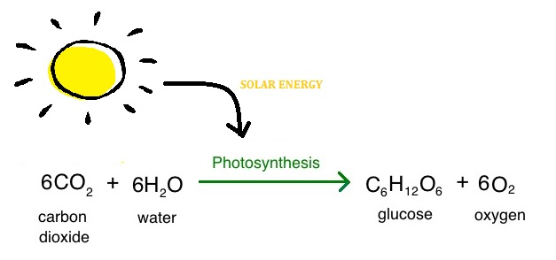 陽光被用來結合水和二氧化碳形成葡萄糖和氧氣。這樣,綠色植物透過形成碳水化合物將太陽能轉化為化學能。