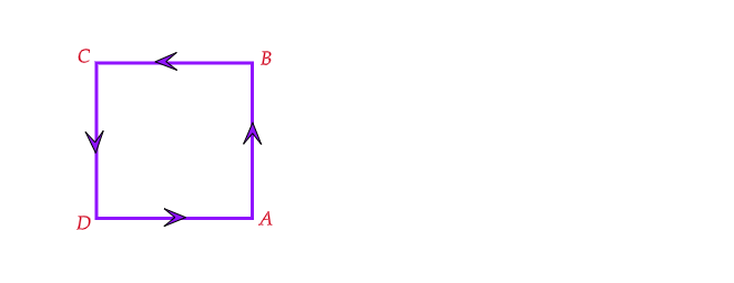 一個物體從點$A$出發,繞一個正方形場地運動,經過點$B$、$C$和$D$後回到點$A$。
